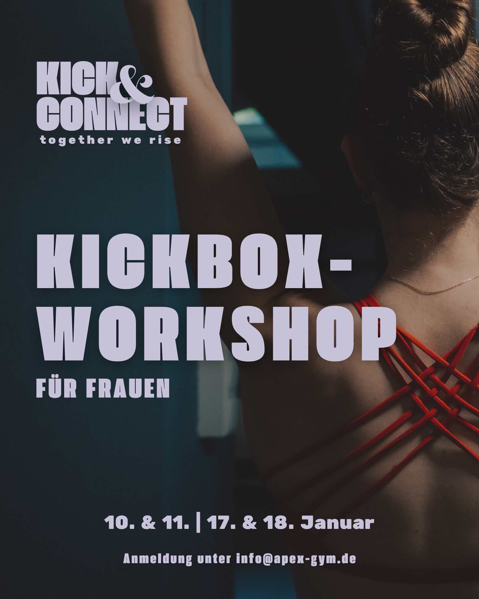 Am 10/11.01.2026 und am 17/18.01.2025 wird es im APEX einen Frauen Kickbox Workshop geben. Also meldet euch schnell an.